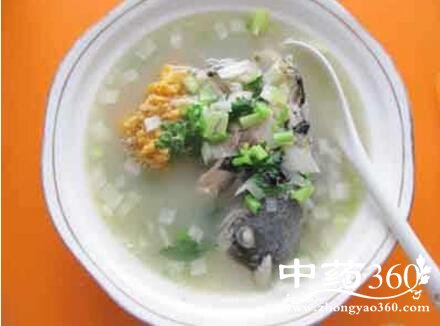 鲫鱼1条(约250克),去鳞、鳃及内脏,洗净,生姜30克洗净,切片,桔皮10克、胡椒3克,共包扎在纱布内填入鲫鱼肚中,加水适量,文火煨熟,加食盐少许,空腹吃鱼喝汤,几次后效果很好!此菜具有治胃寒痛效果。