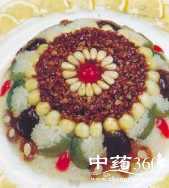 对于体质虚弱的老人,可备齐糯米1000克,白糖250克,葡萄干、核桃仁、瓜子仁、白果仁,莲子、桂圆肉、红豆沙、熟山药、小红枣、青梅、桂花、猪油,淀粉各适量。然后将白果去皮除核,切成四瓣;红枣去核,熟山药去皮切开;再把5只碗抹上猪油,随后将白果等食品在碗内摆成花样,并将糯米淘干净后放入盆内,加水1000毫升,蒸熟后盛出,待凉后加白糖100克搅匀,分200克1份,装在摆好白果等的碗内,再略蒸一下。