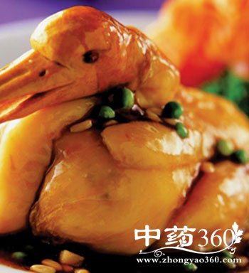 白果50克、杏仁30克、莲子50克、苡仁30克、芡实30克、扁豆30克、虾仁15克、火腿50克、蘑菇30克、糯米100克、肥鸭1只、红酒12克、胡椒粉、食盐各适量。以上十种原料洗净捞出,沥干水分,加绍酒、食盐、胡椒粉拌匀上笼蒸30分钟成八宝馅,装入洗净的鸭肚内,上笼蒸2小时晾开水气,再入八成热油锅炸3分钟,表面成金黄色捞出。