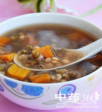 [功效] 绿豆甘凉,清暑、解毒、利尿;配以南瓜生津益气。是夏季防暑最佳膳食。
