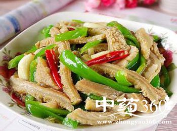 羊肚:羊肚味甘,性温,入脾、胃经,具有健脾补虚,益气健胃,固表止汗之功效,用于虚劳赢瘦、不能饮食、消渴、盗汗、尿频等症。青椒:青椒果实中含有极其丰富的营养,维C含量比茄子、番茄都高,其中芬芳辛辣的辣椒素,能增进食欲、帮助消化,含有的抗氧化维生素和微量元素,能增强人的体力,缓解因工作生活压力造成的疲劳。其中还有丰富的维生素K,可以防治坏血病,对牙龈出血、贫血、血管脆弱有辅助治疗作用。其特有的味道和所含的辣椒素有刺激唾液和胃液分泌的作用,能增进食欲,帮助消化,促进肠蠕动,防止便秘。