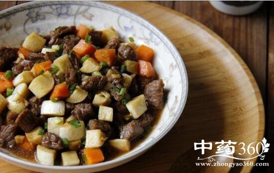 4、再次坐锅热油,爆香蒜末,入茭白炒至五六成熟,加入胡萝卜,加盐,略翻炒;下入事先炒好的牛肉丁,加少量水,淋一点生抽,小火煨至汤汁基本收干,撒上葱花,起锅装盘。