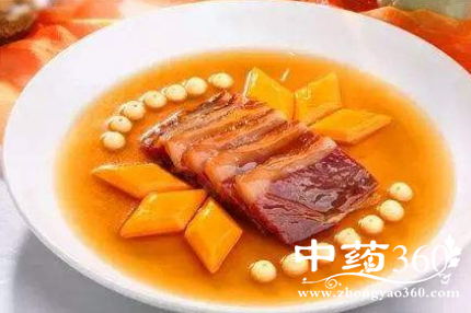 9、将火踵捞出切成片,整齐地覆盖在鸭腹上,加入黄酒、精盐和味精,加盖密封再炖5 分钟左右。