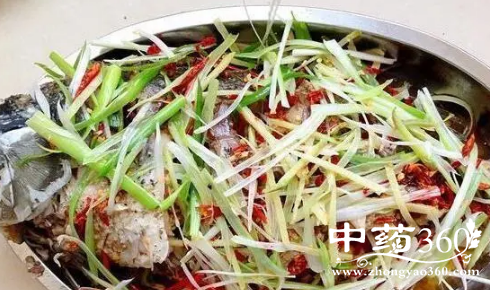 5.将葱姜丝、辣椒丝撒在鱼身上