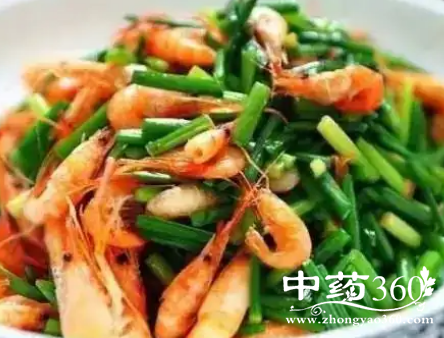 7韭菜略软时,倒入河虾大火翻炒,加盐调味即可出锅。