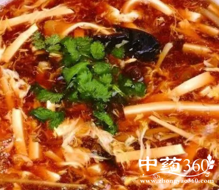 酸辣汤常见主要食材有笋、冬菇、肉丝、蛋花、木耳、猪红、豆腐。以太白粉勾芡,并以黑醋、胡椒粉、或干辣椒与麻油调味。有人相信酸辣汤具有醒酒的功效。