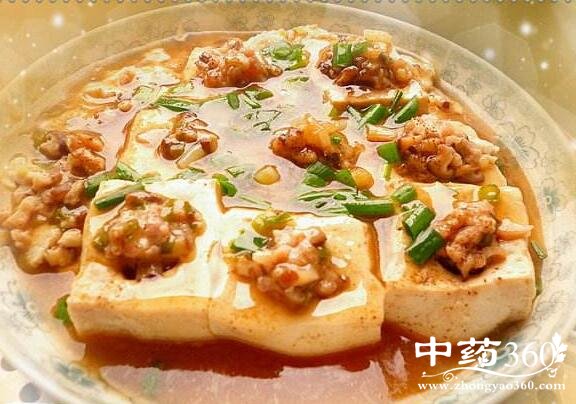 3.取直径约12厘米的小扣碗,将分别拌好的猪肉、豆腐整齐地摆放碗内(1块肉1块豆腐互相间隔,每碗约摆8块,正面6块,两边各镶1块),连碗上笼用旺火大蒸至熟透,翻扣入碗,撒上葱花即成。