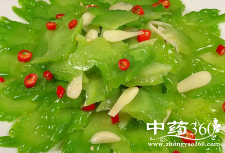 (2)将苦瓜条加辣椒丝和精盐后,控出水分,然后放凉开水中浸凉捞出,放人酱油、豆瓣酱、蒜泥和熟油拌匀即可。小诀窍苦瓜宜选绿色的。白色的老,且苦。