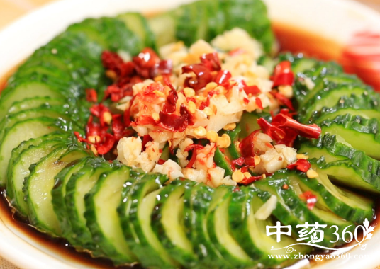 7、将干辣椒掰成小块,连同蒜末一起放在黄瓜上。将调味汁用小勺均匀地淋在黄瓜上。