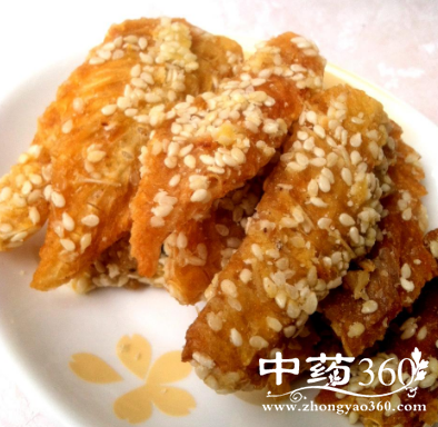 2)芝麻放在锅中偏炒至熟,把鱼泥料挤成直径1.2厘米的丸子,周身上沾芝麻。