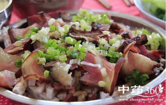 2. 熏腊肉切成薄片,放入沸水中焯一下水,捞起放进冷水中洗净油沫和杂质,控干水盛起备用