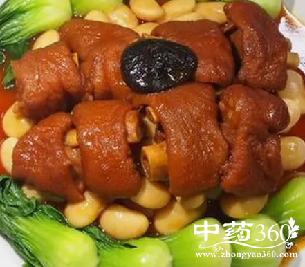 4.4、汤收到浓稠,将肘子称出来放盘子上,浇上锅底的汁儿,撒上焖熟的黄豆,撒上香菜。