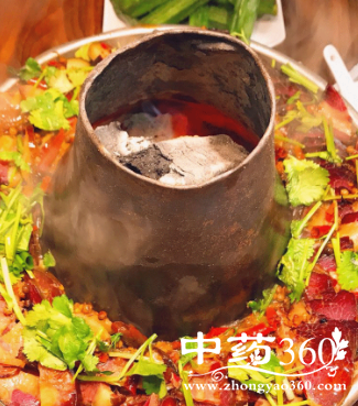 3.把青菜头切成大一字条,放在铜火锅下面垫底,再把香肠片、腊肉片和腊排块整齐地摆在上面,灌入烧开的原汤,盖上铜火锅盖子,在烟囱里放上烧火的木炭。