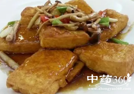 3、烧锅下油烧至七成热,放入茶树菇炸至干身,捞起放在煲仔内,再将豆腐块选6件,裹上湿粉蛋浆,放入油锅内炸至金黄色,放入煲仔内排列整齐。