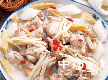 兔肉(野):野兔肉质地细嫩,味道鲜美,营养丰富。兔肉富含大脑和其他器官发育不可缺少的卵磷脂,有健脑益智的功效。经常食用可保护血管壁,阻止血栓形成,对高血压、冠心病、糖尿病患者有益处,并增强体质,健美肌肉,它还能保护皮肤细胞活性,维护皮肤弹性。兔肉中所含的脂肪和胆固醇,低于所有其他肉类,而且脂肪又多为不饱和脂肪酸,常吃兔肉,可强身健体,但不会增肥,是肥胖患者理想的肉食,女性食之,可保持身体苗条,因此,国外妇女将兔肉称为“美容肉”;而常吃免肉,有祛病强身作用,因此,有人将兔肉称为“保健肉”;兔肉中含有多种维生素和8种人体所必需的氨基酸,含有较多人体最易缺乏的赖氨酸、色氨酸,因此,常食兔肉防止有害物质沉积,让儿童健康成长,助老人延年益寿。白萝卜:白萝卜是老百姓餐桌上最常见的一道美食,含有丰富的维A、维C、淀粉酶、氧化酶、锰等元素。另外,所含的糖化酶素,可以分解其他食物中的致癌物亚硝胺,从而起到抗癌作用。对于胸闷气喘,食欲减退、咳嗽痰多等都有食疗作用。金针菇:金针菇含有人体必需氨基酸成分较全,其中赖氨酸和精氨酸含量尤其丰富,对增强智力尤其是对儿童的身高和智力发育有良好的作用,人称“增智菇。”更加引人注目的是金针菇中还含有一种叫朴菇素的物质,有增强机体对癌细胞的抗御能力。常食金针菇还能降胆固醇,预防肝脏疾病和肠胃道溃疡,增强机体正气,防病健身。金针菇中含锌量比较高,也可有促进儿童智力发育和健脑的作用。金针菇能有效地增强机体的生物活性,促进体内新陈代谢,有利于食物中各种营养素的吸收和利用,对生长发育也大有益处。金针菇可抑制血脂升高,降低胆固醇,防治心脑血管疾病。另外食用金针菇具有抵抗疲劳,抗菌消炎、清除重金属盐类物质、抗肿瘤的作用。而且中医认为,补肝,益肠胃,抗癌;主治肝病、胃肠道炎症、溃疡、癌瘤等病症。腐竹:腐竹中含有丰富蛋白质,营养价值较高;其含有的卵磷脂可除掉附在血管壁上的胆固醇,防止血管硬化,预防心血管疾病,保护心脏;含有多种矿物质,补充钙质,防止因缺钙引起的骨质疏松,促进骨骼发育,对小儿、老人的骨骼生长极为有利;还含有丰富的铁,而且易被人体吸收,对缺铁性贫血有一定疗效。