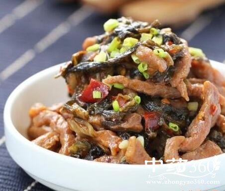 1. 咸菜洗净,切丝,用温水浸片,拧干水分,木耳浸软,洗净备用