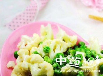 菜花:菜花中丰富的维C、胡萝卜素、硒、维K、等多种具有生物活性的物质。对人体可增强肝脏解毒能力、提高机体的免疫和抗病能力、防止感冒和坏血病的发生、还可防治胃癌、乳腺癌,抑制癌肿生长,减少癌症的发病几率。同时大量的类黄酮、吲哚衍生物和二硫酚硫酮,还可减少心脏病与中风的危险,降低人体内雌激素水平,阻止皮肤色素斑的形成,对肌肤有很好的美白效果。菜花性凉、味甘,可补肾填精,健脑壮骨,补脾和胃。特别适合生长发育期儿童和在污染环境中生活的人食用。豌豆:豌豆中富含优质蛋白质、胡萝卜素,可以提高机体的抗病能力和康复能力,增强机体免疫功能,防止人体致癌物质的合成,降低人体癌症的发病率。豌豆中还含有较为丰富的膳食纤维,能促进大肠蠕动,保持大便能畅,起到清洁大肠,防止便秘,抗癌防癌的作用。豌豆与一般蔬菜有所不同,所含的止杈酸、赤霉素和植物凝素等物质,还具有抗菌消炎,增强新陈代谢的功能。火腿肠:火腿肠含有供给人体需要的蛋白质、脂肪、碳水化合物、各种矿物质和维生素等营养,还具有吸收率高、适口性好、饱腹性强等优点,还适合加工成多种佳肴。火腿肠中含有亚硝酸盐等添加剂,且不多食。