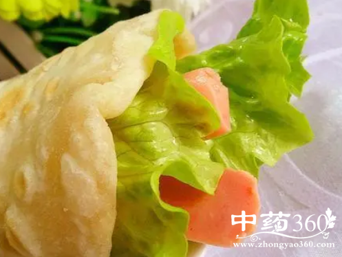 9.把蛋饼平铺在保鲜膜上,铺上生菜,铺上火腿片