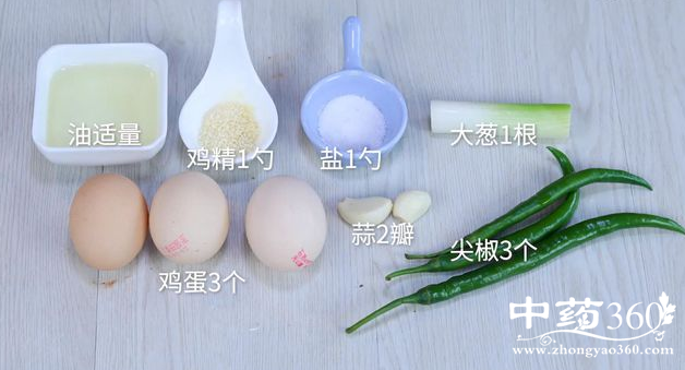 准备食材:鸡蛋3个、尖椒3个、盐1勺、鸡精1勺、蒜2瓣、大葱1根、油适量。