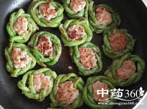 6、锅中热油放入酿豆角小火煎制,放少许水,盖盖子焖至熟烂、入味即可。