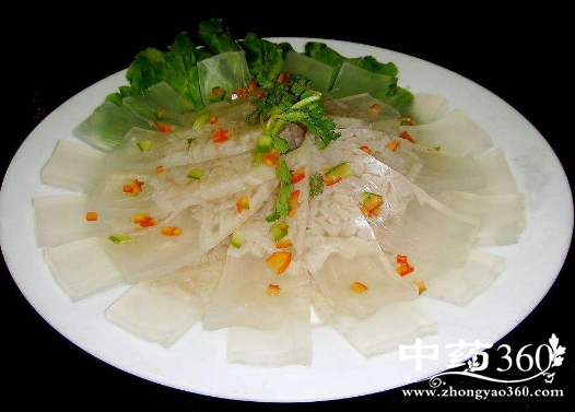 《中华本草》载:猪皮含有蛋白质、脂肪及硫酸皮肤素B,具有软化血管、抗凝血,促进造血功能和皮肤损伤愈合及保健美容作用,其胶质的造血功能优于阿胶,常食可增加血红素含量及白细胞数的增加和抗血栓的形成。富含胶原蛋白,多食可除皱美容。