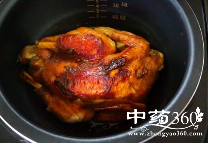 7、插上电源按“煮饭”键,等跳到“保温”键的时候不要急着开盖,焖8分钟左右,然后把腌渍剩余的料汁刷在鸡身上,再刷上层蜂蜜,盖上锅盖继续按“煮饭”键,等再次跳到“保温”键的时候焖5分钟即可乘出,稍晾凉后,切块。