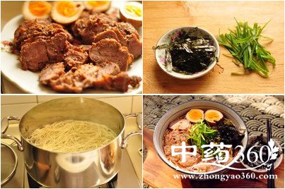 11、捞出面条,浇高汤,淋一点卤汁,放上豚肉、糖心蛋,葱丝海苔丝,在家里感受异国风情。
