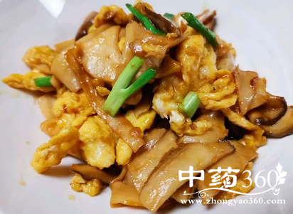 2、锅里放油烧热把鸡蛋煎块,放入蒜爆香再放入肉丝和鸡腿菇,辣椒翻炒。