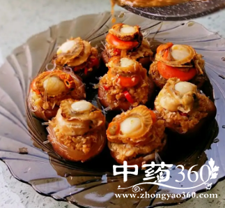 鸡腿菇16个,扇贝8只起肉,菜芯(取后半部)8个,生蛋黄2个,甘蓝叶1张,绿车厘子2枚,鸡胸脯肉丁100克。调料鸡汤150克,韩国烧汁15克,味精、鸡精各15克,糖8克,生粉20克,色拉油750克。做法1、用两个鸡腿菇夹住一只扇贝(要用生粉加入蛋黄调成浆涂抹在2只鸡腿菇的两边),用不粘锅小火煎3-4分钟至两边金黄色盛于盘中。