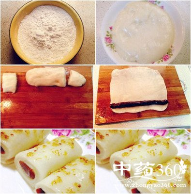 4、面团用擀面杖摊平放入豆沙条卷起(摊面皮时建议四周薄一些方便卷条)