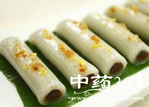 3 在糯米面皮的中下端均匀的挤上一条同等长度的红豆沙,再从下端将糯米面皮卷起,将红豆沙完全裹住,一直卷到糯米面皮上端,然后再用手将整个圆柱状糯米条(直径约2cm)捋顺按实,使糯米面皮紧密的贴合在红豆沙上。