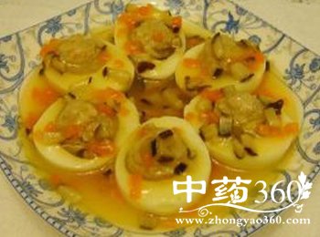 猪肉(肥瘦):猪肉含有丰富的优质蛋白质和必需的脂肪酸,并提供血红素(有机铁)和促进铁吸收的半胱氨酸,能改善缺铁性贫血;具有补肾养血,滋阴润燥的功效;但由于猪肉中胆固醇含量偏高,故肥胖人群及血脂较高者不宜多食。鸡蛋黄:蛋黄中含有丰富的脂肪、卵磷脂、胆固醇、钙、磷、铁等物质;同时含有丰富的高生物价蛋白质;而且维A、维D、维B含量也较多;其中的卵磷脂被人体消化后可以避免智力衰退,增强记忆力,同时还是老年性痴呆的克星;可促进肝细胞再生,提高人体血浆蛋白的含量,促进机体的新陈代谢,增强免疫力;鸡蛋黄性味甘温,有滋阴、宁心安神的作用,治疗阴虚引起的心烦不寐、胃逆呕吐。冬瓜:冬瓜含有多种维生素和人体必需的微量元素,可调节人体的代谢平衡。冬瓜性寒,能养胃生津、清降胃火,使人食量减少,促使体内淀汾、糖转化为热能,而不变成脂肪。因此,冬瓜是肥胖者的理想蔬菜。同时冬瓜有抗衰老的作用,久食可保持皮肤洁白如玉,润泽光滑,并可保持形体健美。此外冬瓜还有良好的清热解暑功效。夏季多吃些冬瓜,不但解渴消暑、利尿、还可使人免生疔疮。因其利尿,且含钠极少,所以是慢性肾盐水肿、营养不良性水肿、孕妇水肿的消肿佳品。