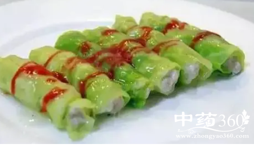 2猪肉片两面均匀沾上醃料后, 包裹适量的蔬菜丝, 收口处抹少许太白粉