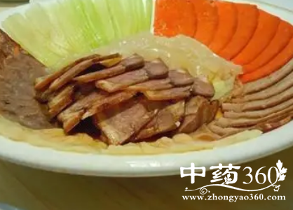 4、松花蛋对切两半,每半再切四瓣,半个扣在盘中做鱼身,另半个摆成鱼尾,用蒜片做鱼眼。