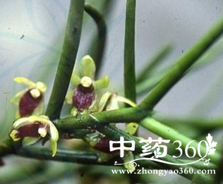 【原形态】钗子股,附生草本植物,高15-30cm。须根发达,粗壮。茎丛生,坚硬,圆柱形,粗约5mm。叶互生,排城2列;叶片圆柱形,肉质,长6-13cm,粗3-4mm,基部具筒状革质鞘。总状花序腋生,长1-1.5cm,具2-4朵花;小苞片宽卵形,覆瓦状排列。花绿色带暗紫红色;萼片和花瓣长圆形,近相等,长约6mm,宽约3mm;唇瓣在中部缢缩面分为前、后唇,才者均近三角状半圆形,前唇先端微凹,上面具乳突。蒴果棒状纺缍形。花期5-7月。