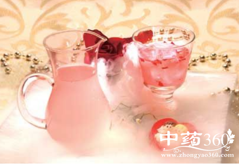 玫瑰露,中药名。为蔷薇科蔷薇属植物玫瑰花(Rosa rugosa Thunb.)的蒸馏夜。原产中国北部。全国各地均有栽培,以山东、江苏、浙江及广东最多。味淡,属于性味平和的一味中药材。具有和中、养颜、泽发功效,常本药材常用肝气犯胃、脘腹胀满疼痛、肤发枯槁等病症。