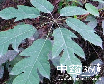 【原形态】乔木灌木,高3-8m。茎粗大,外表暗褐色;小枝粗壮,幼时必生黄棕以星状绒毛,后即脱落;具白以片状髓心。掌状复叶有小叶4-7;叶柄长4-16cm,最长可至70cm,幼时密生星状绒毛,成长圆形,卵状披针形或长圆状披针形,长6-20cm,最长可达35cm,宽2-8cm或稍宽;先端急尖或短渐尖,基部钝形至圆形;全缘具疏离不整齐粗齿或1-3浅裂至深裂,上面无毛,下面密生灰白以或黄棕色星状绒毛,主脉粗而明显;侧脉8-12对,上面坦或微隆起,下面稍隆起,网脉上面稍下陷,稀平坦,下面为绒毛掩盖而不隆起。花无梗,穗状花序聚生成大圆锥花序顶生,长12-10cm,主轴和分枝幼时均密被星状绒毛,后毛逐渐脱落,分枝长10-30cm;苞片卵形,长4-5mm,小苞片三角状卵形,长1-2mm,均密被星状绒毛;萼长1.5-2mm,疏被星状短柔毛,边缘有4-5齿;‘花瓣4-5,三角状卵形,长约2mm,无毛,花白色;雄蕊5,花丝长约3mm;子房下位,4-5室;花柱合生成柱状,柱头不明显,花盘隆起。果实球形,直径约4mm,紫黑色,几无毛;宿存花柱长1.5-2mm。花期10-11月,果期翌年1月。
