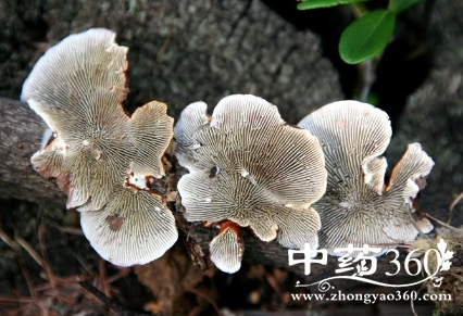 性状鉴别:子实体无柄。菌盖扇形或半圆形,基部狭小,长径2-10厘米,短径2-5厘米,厚5-10毫米。表面锈褐色或灰白色,有或无细绒毛,具较宽的同心性环带,边缘薄而锐。菌肉锈褐色或茶色。菌褶宽26毫米,有分叉,褶缘薄或呈锯齿状。木栓质。气微,味淡。