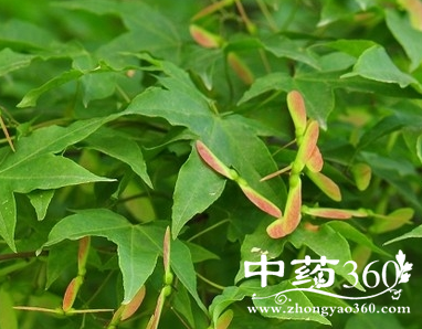 【原形态】色木槭 落叶乔木,高15-20m。树皮粗糙,常纵裂,灰褐色;小枝细瘦,无毛,当年生嫩枝绿色或紫绿色,多年生枝灰色或淡灰色,具圆形皮孔;冬芽近于球形,鳞片卵形。叶对生;叶柄长4-6cm,细瘦,无毛;叶片纸质,外貌近椭圆形,长6-8cm,宽9-11cm,5裂,有时3裂及7裂同生一树;裂片卵形或宽三角形,长渐尖,全缘,无毛,仅主脉腋间有簇毛,主脉5条,在上面显着,侧脉两面均不显着,上面光绿色,下面淡绿色。花多数,杂性,雄花与两性花同株,多数常成圆锥状,伞房花序顶生,无毛;花带绿黄色,总花梗长1-2cm;萼片5,长圆形,黄绿色;花瓣5,椭圆形,淡白色;雄蕊8,无毛,比花瓣短,花药黄色;子房无毛,在雄花中不发育,花柱无毛,柱头2裂,反卷。翅果嫩时紫绿色,成熟时淡黄色,小坚果压扁状,长1-1.3cm,宽5-8mm;翅长圆形,宽5-10mm,连同小坚果长2-2.5cm,张开成锐角或近于钝角,花期5月,果期9月。