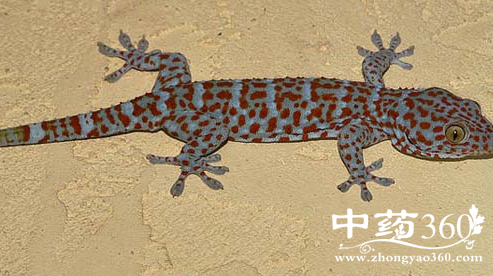 性状鉴别:原形似壁虎而长大。加工后的商品,头尾四足均用竹签撑直,胸腹纵向剖裂,除去内脏后,用竹片撑成扁圆片状。体形大小不一,全长20~30余厘米,腹胸横 宽6~10厘米。全身灰褐色,腹面稍淡,满布圆形或多角形小鳞片,并有黄棕色或棕色花斑。头略呈钝三角形或卵圆形,牙齿无大小之分,均细密如锯齿,生于上下颚骨外缘,上颚前端两侧有 鼻孔一对,头中部有深陷的眼睛一对,后部有裂隙状椭圆形耳窍一对。背部脊椎呈嵴状突起,两旁肋骨微呈线状突起,另有纵列小点状突起十行,年久者突起较高,幼小者不甚显著。四足均 具五趾,除前足第一支趾无勾爪外,其余均具勾爪。趾膨大,底面具单行褶襞皮瓣(有吸附作用,活时可爬行于洞穴悬空的顶面及陡壁之上)。尾长圆锥形,约占体全长的50%左右(活蛤蚧尾 易断落,但再生能力很强。再生尾较短小)。气腥,味微咸,以体形肥大,尾完整不残者为佳。