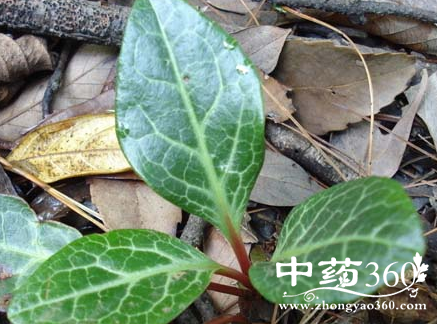 本品根茎细长。茎圆柱形或具纵棱,长10~30cm。叶基生,长卵圆形或近圆形,长2~8cm,暗绿色或紫褐色,先端圆或稍尖,全缘或有稀疏的小锯齿,边缘略反卷,上表面有时沿脉具白色的斑纹,下表面有时具白粉。总状花序有花4~10余朵;花半下垂,萼片5,舌形或卵状长圆形;花瓣5,早落,雄蕊10,花药基部有小角,顶孔开裂;花柱外露,有环状突起的柱头盘。蒴果扁球形,直径7~10mm,5纵裂,裂瓣边缘有蛛丝状毛。气微,味淡、微苦。