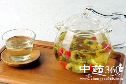 菊花枸杞茶,是用菊花和枸杞同泡而成。每次用杭白菊、枸杞各10克,加入大茶壶内,加入热开水,10分钟后便可饮用