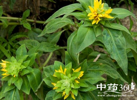 【原形态】多年生草本。茎簇生,直立或有时基部倾卧生根,高10-30(-45)cm,单一或近基部有分枝,被褐色多细胞柔毛。叶对生;叶柄长1-2.5cm,密被柔毛;茎下部的叶较小,常成圆形,茎上部叶较大,茎端的2对间距很短,密聚成轮生状,叶片卵形至卵状披针形,长3.5-11cm,宽1-5.5cm,先端锐尖或钝,基部楔形或近圆形,边缘具缘毛,两面均被糙伏毛,极密或有时稀疏,密布黑色腺条和腺点,侧脉纤细,不明显。总状花序顶生,缩短成近头状;花序轴极短或长达1cm;苞片阔椭圆形或阔倒卵形,长6-25mm,宽5-14mm,先端圆钝,基部渐狭,密被糙伏毛;花梗长2-3mm,密被柔毛;花萼长6-8mm,5裂,分裂近达基部,裂片狭披针形,边缘膜质,背面被毛,有黑色腺条;花冠黄色,长10-15mm,基部合生部分长3-5mm,先端5裂,裂片披针形,先端钝或锐尖,密布黑色腺条;雄蕊5,花丝下部合生成高2.5-3.5mm的筒,被腺毛,分离部分长3-5mm,花药长圆形,长约1.5mm。蒴果近球形,褐色,直径4-5mm。花期4-5月,果期6-8月。