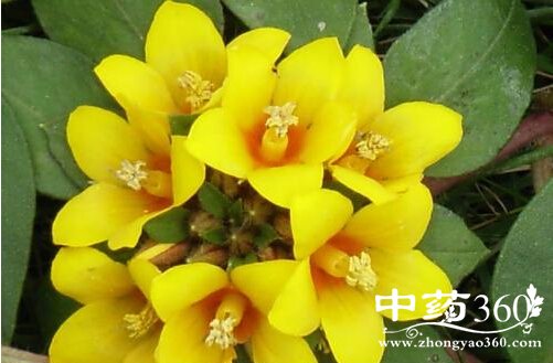 【原形态】一年生草本,高20~30厘米。根呈须状,黄棕色。茎直立,红色或绿色,圆柱形。叶对生,无柄,卵形或椭圆形;长1~2厘米,宽约0.5~1厘米,先端浑圆,全缘,基部略作心形,微抱茎,具腺状长毛。聚伞花序顶生;萼片5~6,卵状披针形,绿色,先端尖,边缘具红色长腺体;花瓣5~6,黄色,椭圆状卵形,顶端锐;雄蕊多数,基部合成3束,长短不等,花丝黄色,花药椭圆形,黄色;雌蕊1,子房上位,卵圆形,3室,秃净,花柱3。蒴果近圆锥形,长约3毫米,室间开裂。种子多数,棕色,细小。