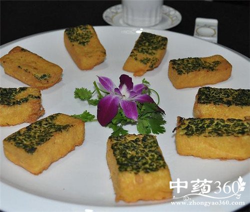 1、将木棉豆腐切片擦乾,地瓜粉倒在盘中,沾上两面。