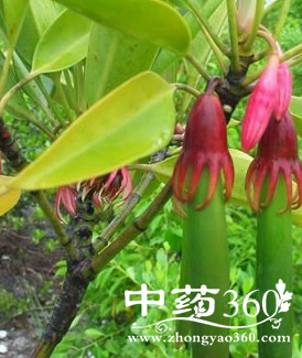 【原形态】灌木或乔木,常有曲膝状气根突出水面。单叶对生;叶柄长2.5-4.5cm;托叶早落;叶革质,椭圆形或狭椭圆形,长7-14cm,宽3-5.5cm,花柄向下弯,长8-20cm;萼管近钟形,暗黄红色,萼裂片11-13片,以12片居多,裂片线形,约与萼管等长;花冠淡红白色,与花萼裂片同数而较短,2深裂,基部密被绢毛,上部近无毛,裂缝间有刺毛1条,裂片先端有2-4条刺毛;雄蕊数目为花瓣的1倍,略短于花瓣;子房下位,2-4室。果包藏于萼筒内且与其合生,1室,萼筒长于裂片;种子1,于果离母树前发芽,胚轴纺锤形,稍有棱角,长15-25cm。花、果期几全所。