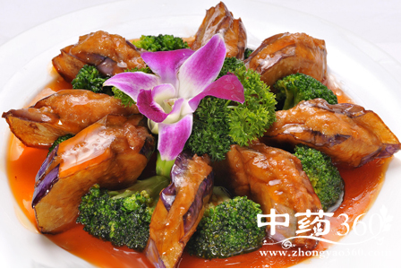 (4)把汤沥勺内,茄块扣入盘中,再把原汁用湿淀粉勾芡,淋明油,烧在茄块上即好。