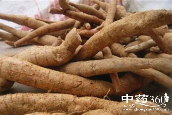块根圆柱状或几个纺锤状体连成一串,浅黄色或土黄色,稍粗糙,有环纹。商品多为切成长4~9厘米,宽2~3厘米、厚约0.5~1厘米的块片。横切面皮部近白色,其内侧为一层不很明显的棕色环纹,中间部分近白色,粉质,略疏松。老根近木质,坚韧,嫩根质脆,易折断。气微,味微甜。以片大、色白、粉质、味甜者为佳。