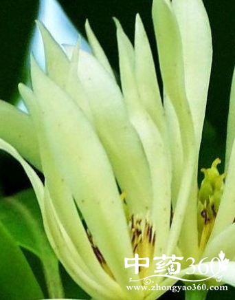 常绿乔木,高达10~20米(江,浙等地天气较寒,常呈灌木状,高仅1~2米);树皮灰色,幼枝和芽被白色柔毛。叶薄革质。互生,卵状椭圆形或长圆形,长10~25厘米,宽4~9厘米,两端均渐狭,两面无毛或于下面被疏毛,小脉网状;叶柄长1.5~2厘米,上有短的托叶痕迹,约为柄全长的1/3或1/4。花白色,单花腋生,极香,长3~4厘米;萼片长圆形;花瓣线状,长3.2厘米;雄蕊多数,多列,花丝扁平;心皮多数,胚珠在每心皮内多于2,螺旋状排列于延长有柄的花托上,子房被毛,柱头头状。果近球形,由多数开裂的心皮组成,多不结实。花期7月。