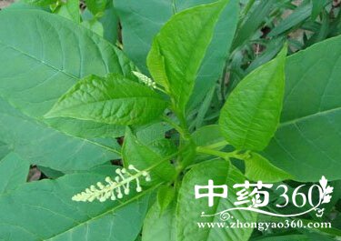 多年生草本,高达1.5m。全株光滑无毛。根粗壮,圆锥形,肉质,外皮淡黄色,有横长皮孔,侧根甚多。茎绿色或紫红色,多分枝。单叶互生,具柄;柄的基部稍扁宽;叶片卵状椭圆形或椭圆形,长12-15cm,宽5-8cm,先端急尖或渐尖,基部渐狭,全缘。总状花序生于技端或侧生于茎上,花序直立;花被片5,初白色后渐变为淡红色;雄蕊8-10;心皮8-10个,分离,但紧密靠拢。浆果,扁圆状,有宿萼,熟时呈深红紫色或黑色。种子肾形黑色。花、果期5-10月。